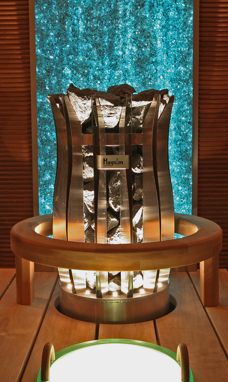 Die Saunabeleuchtung lässt sich durch ein Glasbruchpaneel mit Farbwechsel, Aufgusswasserschalen sowie eine Saunaofenbeleuchtung vervollständigen.