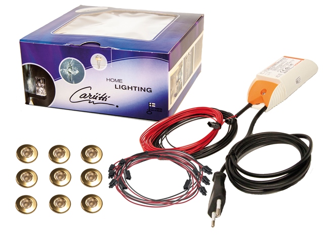 Asennusvalmiissa sarjassa on yhdeksän CR-70 valaisinta, syöttöjännitteestä himmennettevä virtalähde sekä kytkentäjohdot liittimineen.